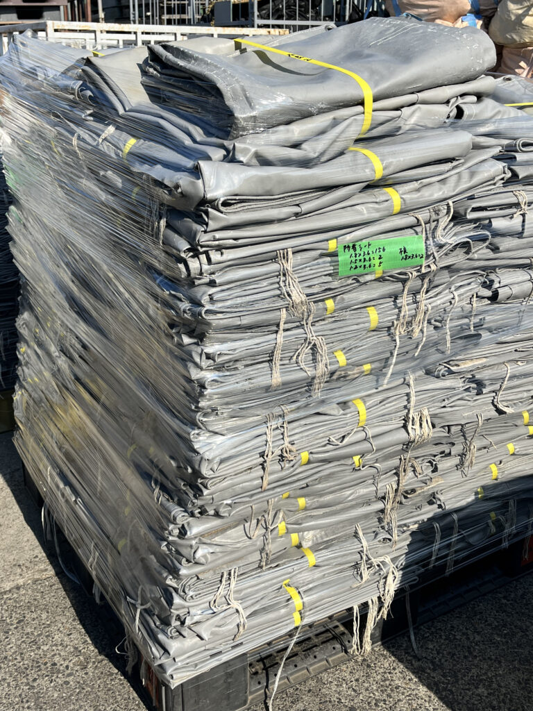 土汚れなどを除去→生地の状態を仕分け→穴の補修→綺麗に畳み直しております。